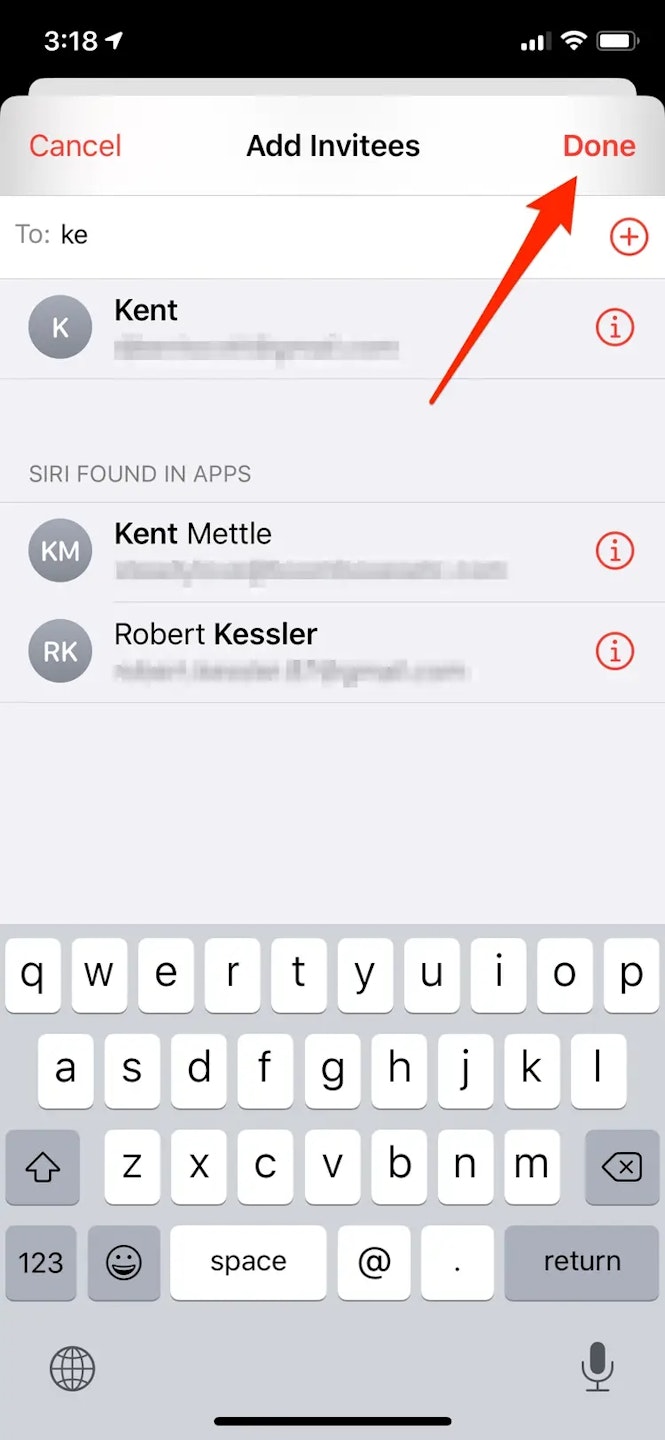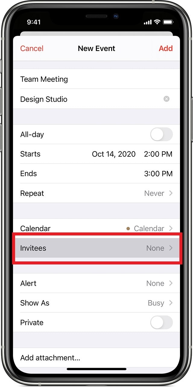 - Tap on "Invitees" and put in the user(s) email you want to add to this calendar invite.