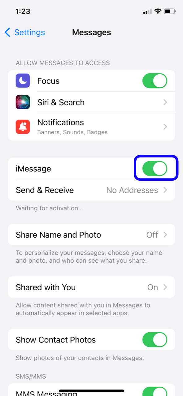 - Toggle the circle to turn on iMessage
