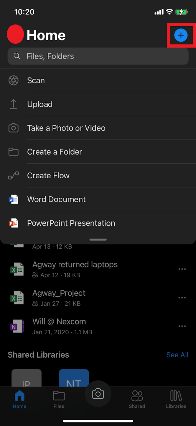 Then tap to Take a photo, Scan a document, Create a folder or Upload a file or photo.