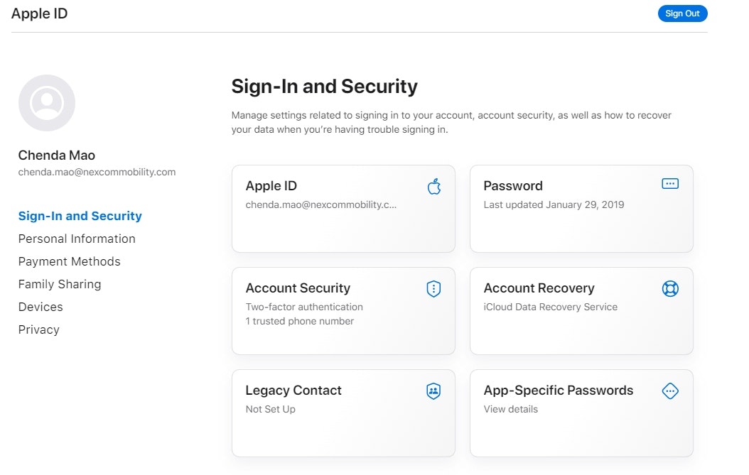 - Sign-in and Security - Apple ID information, password change, and adding another trusted number for 2-factor authentication.